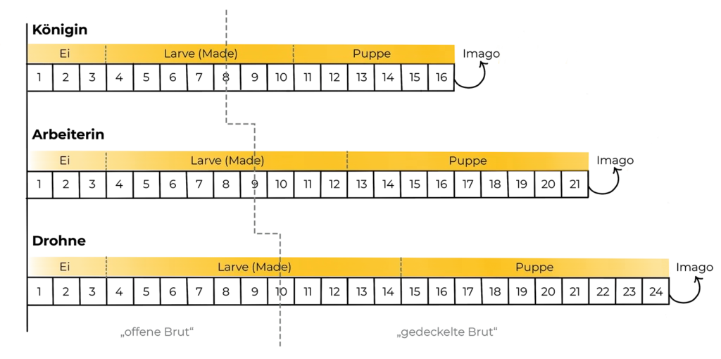 Grundsätzlich sind die einzelnen Entwicklungsvorgänge bei den drei verschiedenen Bienenwesen gleich. Verschieden sind nur die Entwicklungszeiten.